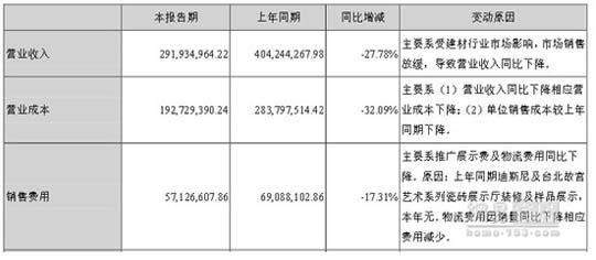 \u00A0 \u00A0 其中,瓷磚銷量同比減少152萬平方米,減幅29%,按上年毛利率計(jì)算減少毛利2,967萬元;單位平均售價(jià)同比下降2.17元/每平方米,減幅3%,影響毛利額減少809萬元;單位平均銷售成本下降3.70元/平方米,減幅7%,影響毛利額增加1,377萬元。高性能裝飾板材銷售額同比上升110%,創(chuàng)造毛利額143萬元。另公司加強(qiáng)內(nèi)部及外部管控,本報(bào)告期三項(xiàng)費(fèi)用同比下降11.67%。