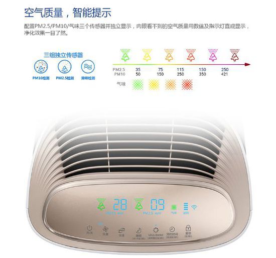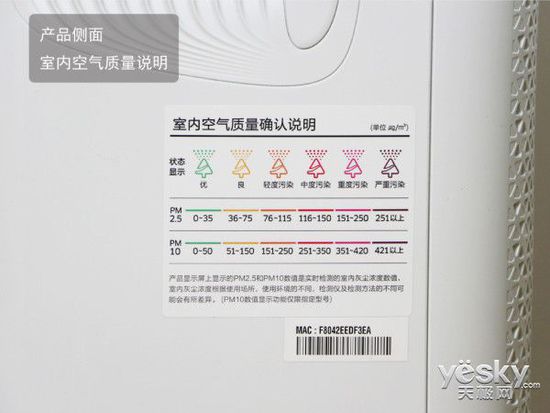 作為輔助,產(chǎn)品一側(cè)配有PM2.5、PM10傳感器,另一面則貼有室內(nèi)空氣質(zhì)量確認說明,面板中現(xiàn)實的空氣質(zhì)量指示燈顏色,與中國AQI標準完全保持一致。