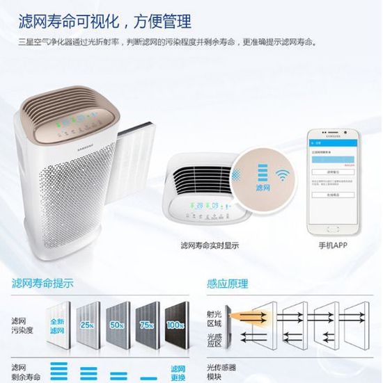 據(jù)了解,產(chǎn)品濾網(wǎng)壽命的計算方式是利用光折射原理,判斷濾網(wǎng)污染程度,并非單純的倒計時,方法更科學(xué),避免過早或是過晚更換濾網(wǎng)造成一些不良隱患。