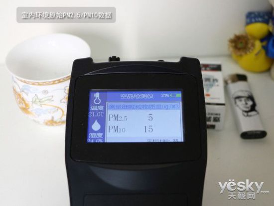首先,我們測出在20m3左右的室內(nèi),先測出原始環(huán)境空氣質(zhì)量,PM2.5僅有5μg/m3,PM10顯示數(shù)值也只有15μg/m3。