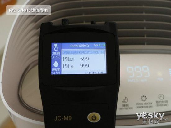 之后,點燃煙片,我們看到無論是我們手中的空氣質(zhì)量測試儀,還是機器顯示面板,均顯示PM2.5及PM10爆表的狀態(tài)。