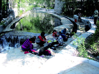 書院泉邊景色美。 □文/片本報(bào)記者王富曉“再過幾天就迎來我爸媽的金婚大喜,趁著這個(gè)假期,就想多帶老人轉(zhuǎn)轉(zhuǎn),今天就專門來到了《生活日報(bào)》推薦的這個(gè)書院泉,沒想到在這里遇到你們,真是太高興啦!”3日上午11點(diǎn)鐘,在平陰縣洪范池鎮(zhèn)書院泉旁,48歲的董建敏一家10口人憑借集體的智慧,一路過關(guān)斬將,輕松奪得本報(bào)送出的大獎(jiǎng)。不到一個(gè)小時(shí),三個(gè)各具特色的家庭,紛紛獲得了本報(bào)送出的大禮。\u00A0\u00A0\u00A0\u00A010口之家通力合作,神秘大禮給老人慶金婚在書院泉旁,許多從市區(qū)趕來的市民繞村一周,專門欣賞書院泉的汩汩泉水,以及泉水繞村帶來的愜意和神奇。 48歲的董建敏一家,可謂陣容齊整,浩浩蕩蕩:75歲的公公、72歲的婆婆,自己一家,哥哥嫂子一家,還有侄女和侄女婿等,一共10口人,大家一邊在泉邊嬉戲,一邊陪著老人看泉邊的各個(gè)景點(diǎn)。得知記者是此次“泉水人家”書院泉尋寶活動(dòng)的組織者,75歲的王國安老人來了興致,給記者講起了“泉水人家”評選活動(dòng)的前前后后,“你們這個(gè)活動(dòng),我一直關(guān)注著,這次一家人在路上花了4個(gè)多小時(shí)來到這里,就是想看看你們推薦的這個(gè)書院泉,景色到底有多美!庇浾咦尷先酥v講對書院泉的了解,旁邊的兒子、兒媳婦紛紛上前獻(xiàn)計(jì)獻(xiàn)策:“村民白天在泉邊浣衣洗菜,晚上枕泉入眠”、“據(jù)說這里的村民都非常長壽,400多口人,80歲以上的有十幾人……”看來,一家人是有備而來,大禮包自然應(yīng)該奉上。對此,董建敏高興地告訴記者,再過半個(gè)月,就是兩位老人金婚大喜的日子,老兩口心態(tài)非常好,就想趁著國慶假期,一家人一起出來轉(zhuǎn)轉(zhuǎn),也算是提前慶祝他們的金婚大喜,“前兩天看了看西客站,去了趟南部山區(qū),今天開了兩輛車一路奔波到了書院泉,百聞不如一見,今天一看真是覺得沒有白來!倍谌赃,王國安老人也跟孩子似的樂開了花。從泉池中采擷幾片水草,在孩子們的鼓動(dòng)下,老人把它們當(dāng)作鮮花送給了老伴王秀麗,老太太見狀,突然有些害羞,很快又陶醉在幸福中。隨后,王國安老人又把本報(bào)送去的禮物送給了老伴,一家人在泉邊,留下了一個(gè)個(gè)讓人羨慕的身影。\u00A0\u00A0\u00A0\u00A0資深驢友拿著報(bào)紙踩點(diǎn),笑言真想在泉邊睡一晚3日上午11點(diǎn)半左右,在書院泉旁邊的山腳下,三位中年人邁著矯健的步伐、帶著相對專業(yè)的裝備,吸引了記者的注意。記者上前詢問得知,三人是資深旅游愛好者,這次專門帶著一份《生活日報(bào)》,想把近郊的景點(diǎn)提前踩點(diǎn),然后告知自己的一群驢友。而他們對于泉水知識的熟悉,也遠(yuǎn)遠(yuǎn)超出了記者的想象!按蠹s一星期之前吧,我和妻子看了你們報(bào)紙對書院泉的介紹,里面對我吸引最大的,就是說清朝時(shí)期,村民把飯菜做好后,放在木托盤上,飯菜就會從廚房的水渠順?biāo)髦临e客房內(nèi),真是太神奇啦!”56歲的姚念樸頗為得意地告訴記者,自從看了介紹之后,他就非常留意對書院泉的介紹,“今天專門上網(wǎng)查了地圖和行車線路,從市區(qū)出發(fā),一路走了三個(gè)多小時(shí),終于找到了這個(gè)地方!迸c老姚一起的,還有自己的妻子以及朋友老付!拔覀儙讉(gè)都是鐵路系統(tǒng)的,平時(shí)喜歡旅游,也算得上是資深驢友了,像三王峪、朱家峪等景點(diǎn),在出名之前我們都游玩過,這次朋友們拜托我們幾個(gè)踩點(diǎn),要是覺得好的話,有機(jī)會再一起過去!崩细兑蔡寡,雖然這個(gè)景點(diǎn)周圍還沒有開發(fā),但是,這種純天然的地方,真是讓人流連忘返!案杏X比南部山區(qū)要好,至少人沒那么多,景色也不輸給那些景區(qū)!崩弦Φ钠拮右残χf,“真想晚上不走了,在泉邊睡一晚,再找個(gè)農(nóng)家,煮點(diǎn)面條、炒幾個(gè)雞蛋、喝個(gè)小酒,那才叫美呢!”\u00A0\u00A0\u00A0\u00A0為了女兒順利寫作文,一家三口泉邊游時(shí)近中午12點(diǎn)鐘,游客漸漸多了起來,環(huán)繞村莊靜靜流淌的泉水旁邊,時(shí)常能見到洗酸棗、泡山楂、涮地瓜的游客。而在泉邊的碑旁,有一家三口一直在對照著碑文,仔細(xì)地辨認(rèn)著,并不時(shí)拍幾張照片。原來,他們兩口子是為了女兒寫作文,一家人在熟悉著泉水的典故,以及泉池旁邊的一草一木。家住平陰縣城的張廷亮告訴記者,他們已經(jīng)多次來到書院泉,這次“十一”假期,女兒晴晴因?yàn)橐獙懸黄P(guān)于泉水的作文,于是,一家三口特意驅(qū)車20余公里,來到了平陰縣城的最南端。由于功課做得充分,一家人對于泉水的歷史,可謂了如指掌,而對于濟(jì)南市區(qū)內(nèi)的幾大名泉,9歲的晴晴略顯遺憾地說,“還是很小的時(shí)候去的,現(xiàn)在很想去看看趵突泉和黑虎泉!睘榱藵M足小姑娘的心愿,記者特意拿出了幾張趵突泉的門票,并把大禮包贈送給了這一家三口。晴晴高興地說,“爸爸媽媽,趁著假期還沒結(jié)束,咱們明天就一起去看趵突泉吧!”泉水旁邊,記者的相機(jī)內(nèi),留下了這一家三口幸福的一瞬間。