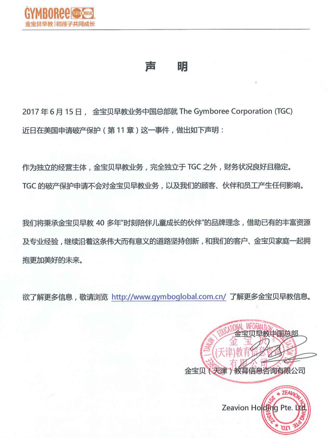 今日,金寶貝早教業(yè)務(wù)中國(guó)總部向《聯(lián)商網(wǎng)》發(fā)來(lái)聲明,表示金寶貝早教業(yè)務(wù)作為獨(dú)立經(jīng)營(yíng)個(gè)體,財(cái)務(wù)狀況良好且穩(wěn)定,TGC的破產(chǎn)保護(hù)申請(qǐng)并不會(huì)對(duì)金寶貝早教業(yè)務(wù),以及其客戶(hù)、伙伴和員工產(chǎn)生任何影響。