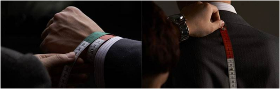 在制作手工西裝前,設計師會先詢問客人日常動作習慣,穿西裝場景及需求,為客人推薦合適的材質及款型。在量身時,對客人的各種微小體型特征(如斜肩/直肩、小肚/大肚子)都仔細測量,絲毫不能馬虎,因為任何一個小失誤都有可能毀掉整件西裝。裁制過程中,細節(jié)至上。西裝上所有扣眼都必須手工鎖、條紋或者格子面料的西裝注意對條或對格、身上的格子和袖子上的格子也裁剪一致。