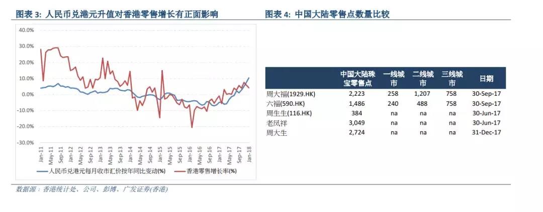 香港珠寶行業(yè)零售銷售額增長有所改善,從4Q17高個位數(shù)提高到2018年1月的10%,盡管在今年春節(jié)假期日期上的不利變動 (從去年一月底往后推至二月中旬)。根據(jù)新聞報道,周大福在春節(jié)假期期間實現(xiàn)了兩位數(shù)的銷售額增長。我們通過渠道調(diào)研了解到,這一增長勢頭在春節(jié)假期過后得到延續(xù)。我們預計周大福和六福4QFY18在香港市場的同店銷售額能夠達到高個位數(shù)增長,好于此前低個位數(shù)增長的預期。