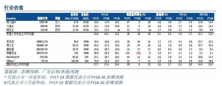 我們預計兩家公司4QFY18香港市場的同店銷售額達到高個位數(shù)增長,高于我們之前低個位數(shù)增長的預期。考慮到兩家公司將跟隨國內(nèi)同行在二三線城市的擴張步伐,我們同時提高了對FY19中國新開門店的預期。我們上調(diào)了盈利預測,并將周大福的評級從“持有”上調(diào)至“買入”,將六福的評級從“減持”上調(diào)至“持有”。催化劑:1)4月份發(fā)布4QFY18數(shù)據(jù);2)6月發(fā)布FY18的業(yè)績結果。