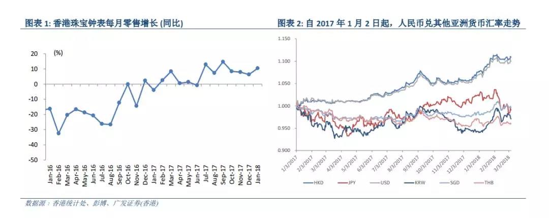 春節(jié)假期期間,中國大陸訪港旅客同比增長約14%,較2017年12月的7%增長有所加快,我們認為這歸功于人民幣兌港元升值。年初至今,人民幣兌港元匯率已經(jīng)上升3%,但兌日元和泰銖匯率分別下跌3%和1%。與去年同期相比,目前人民幣相對港元升值10%,而相對日元、韓元和新加坡元僅升值1-2%,使得內(nèi)地游客在香港的購買力高于在其他幾個旅游國家的購買力。從歷史上看,人民幣升值對香港零售銷售增長是有利的(圖表3)。由于香港和美國之間的利差不斷擴大,預計港元在2018年將保持疲弱。