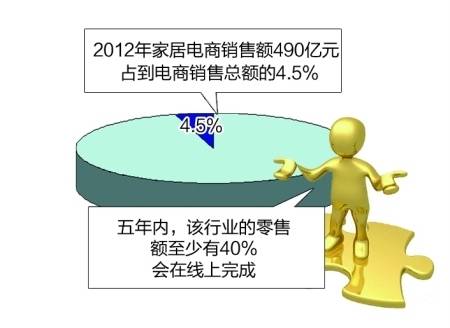 此外,電商也被認(rèn)為是造成家居賣(mài)場(chǎng)銷(xiāo)售被分流的一大因素。據(jù)中國(guó)電子商務(wù)研究中心調(diào)查數(shù)據(jù)顯示,2012年家居電商銷(xiāo)售額490億元,占到電商銷(xiāo)售總額的4.5%。中國(guó)家具銷(xiāo)售商聯(lián)合會(huì)會(huì)長(zhǎng)李俊明近日就對(duì)媒體表示,五年內(nèi),該行業(yè)的零售額至少有40%會(huì)在線上完成。