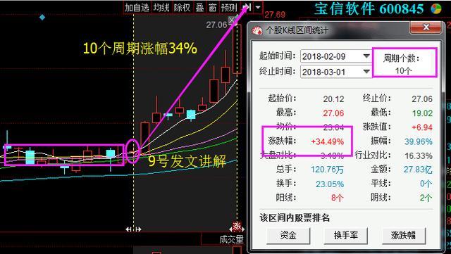 寶信軟件(600845),此股前期在股價(jià)簡(jiǎn)單粗暴的以漲停板狙擊下跌趨勢(shì),放量拉升,通過(guò)選股法選出來(lái),選出之后這只股票幾個(gè)交易日的漲幅已經(jīng)超過(guò)了34%,很多之前看過(guò)選股文章的新手股民朋友都抓到了這一波34個(gè)點(diǎn)的收益,再次的恭喜那些抓到這一波收益的新手朋友。