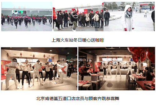 2月初寒冷的上海火車站南廣場,突然出現(xiàn)都戴喜慶紅帽子的年輕人,跳起恭喜快閃舞,并給圍觀的路人送上暖暖的咖啡以及誠心的新年祝福,暖心的行為讓春節(jié)帶來的焦慮感一掃而空。在北京五道口肯德基門店、西安高新萬達門店,店員正在忙碌著為消費者服務(wù)的同時,突然廣播中響起了熟悉的音樂,店員們立刻集體停下手中的工作,開始跳恭喜恭喜,并給當場的消費者免費贈送咖啡。這一波突然的驚喜,讓肯德基又趁機圈了不少的死忠粉。