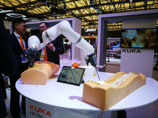 庫卡新一代的醫(yī)用通用機(jī)器人平臺LBR Med (圖7)也亮相展會。LBR Med的特點(diǎn),一是,無需附加裝置即可進(jìn)行校準(zhǔn)并實(shí)現(xiàn)高精度作業(yè)。集成了零點(diǎn)標(biāo)定傳感器,它可完全自主校準(zhǔn)。二是安全, 通過其軟硬件對相關(guān)信號進(jìn)行安全性分析。裝備主要包括傳感器信號、力矩傳感系統(tǒng)、安全電路、初次故障安全性、安全接口及可配置的安全事件。三是靈敏,具有冗余的內(nèi)置扭力傳感器。