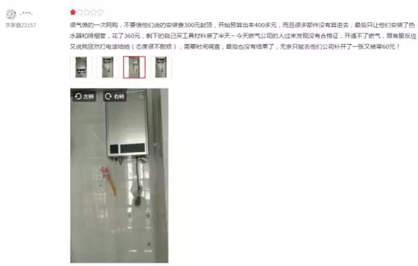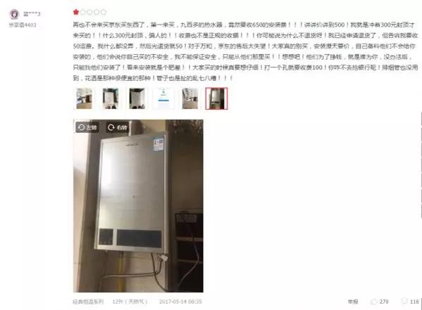 還有一位網(wǎng)友稱其讓安裝人員“安裝熱水器和排煙管,花了360元,剩下的自己買工具裝了半天”結(jié)果安裝人員沒有提供合格證,無奈之下,該用戶只能去補(bǔ)開合格證,結(jié)果“又被宰60元”。合格證是在熱水器安裝完成后必須出具的證明,表示熱水器合格可用,在這種情況下,商家收取消費(fèi)者60元是不合理的。