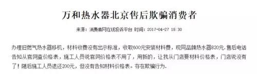實(shí)際上,萬和熱水器的高價(jià)安裝費(fèi)用已經(jīng)不是第一次為人詬病,早在2017年就已經(jīng)有消費(fèi)者在消費(fèi)投訴網(wǎng)站對(duì)萬和的亂收費(fèi)現(xiàn)象進(jìn)行了曝光。該消費(fèi)者稱“售后電話告知從官網(wǎng)查價(jià)格表,施工人員說官網(wǎng)價(jià)格表不用了,用新的,讓我從門店要材料價(jià)格表,門店說沒有。”