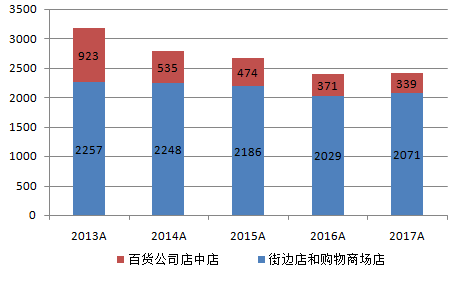 2013年底公司共擁有3180家店鋪,至2016年底,公司店鋪減少至2410家,五年內(nèi)共減少了780家門店(25%),其中百貨公司店鋪凈減少584家,開店戰(zhàn)略向購物中心等人流量更好的地方轉(zhuǎn)移。2017年,公司的店鋪終于調(diào)整到位,結(jié)束了達5年的減少店鋪趨勢,公司凈開店數(shù)增加了10家。