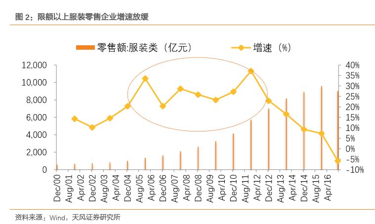 2004年~2012年,隨著居民收入以及消費能力不斷提高,我國服裝零售業(yè)經(jīng)歷了數(shù)十年的高速發(fā)展,8年間限額以上服裝企業(yè)零售額增速保持在20%以上。