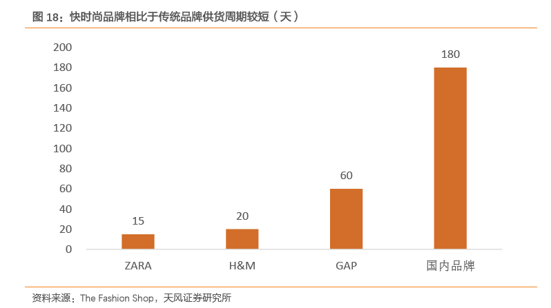 相對于當(dāng)時的傳統(tǒng)品牌來說,快時尚品牌具有更高的性價比,牢牢抓住中國消費者的偏好。從供應(yīng)鏈來說,快時尚品牌擁有非常短的供應(yīng)周期,從產(chǎn)品設(shè)計到成品上架基本僅需要15-60天,而國內(nèi)品牌需要6-9個月。