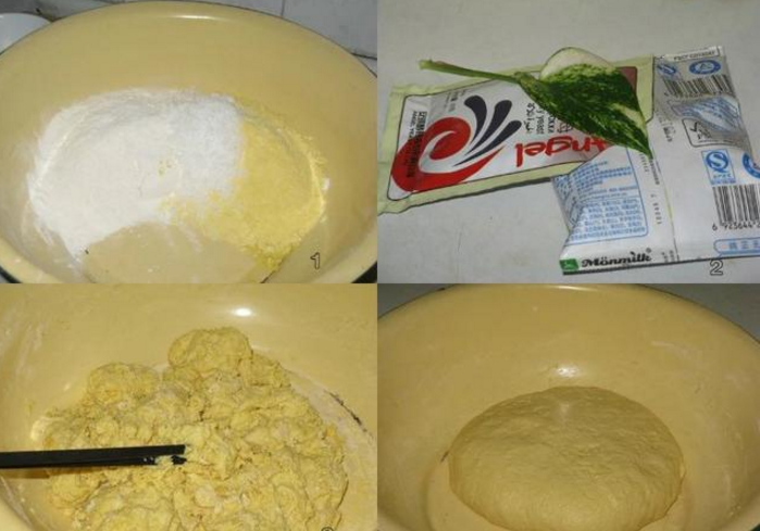 一:和面:選一比較大的盆,玉米面與白面按1:1,加適量白糖(以自己口味),攪勻;,加適量酵母到牛奶里和開,一袋牛奶若不夠,可以加水,我用的兩袋牛奶,這樣奶香味大;把牛奶慢慢加入面里,邊加邊用筷子攪拌,最后再用手反復(fù)揉面,不要惜力,一定要把面揉勻,做到“三光“,面光、手光、盆光。把面盆放置發(fā)面。
