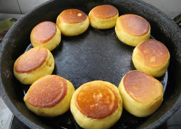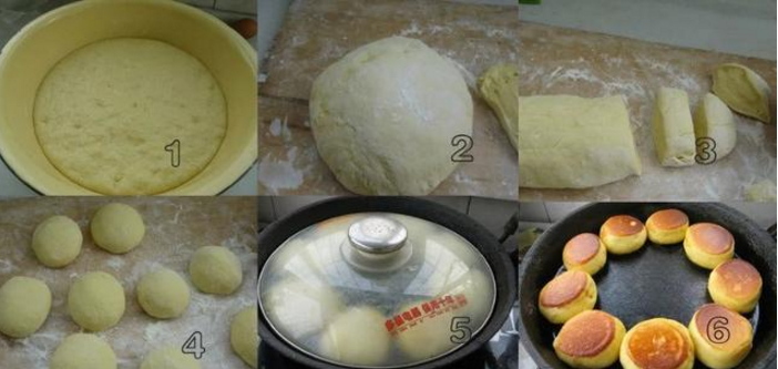 二:面發(fā)到原來面塊的2倍大,而且用手指一扯會看到面里有很多小孔,就證明面發(fā)好了。把面放案板上,加敷面揉面,作成長條,切成小劑子,揉成饅頭型(可以按成餅型,我的面軟,不用)。坐平底鍋放少許油,油熱,把做好的劑子,擺放到鍋里煎,每個之間要留有間隔,熟后會膨脹變大,關(guān)小火,慢慢煎,一面金黃了,反面再煎,和烙餅差不多,直到餅熟。