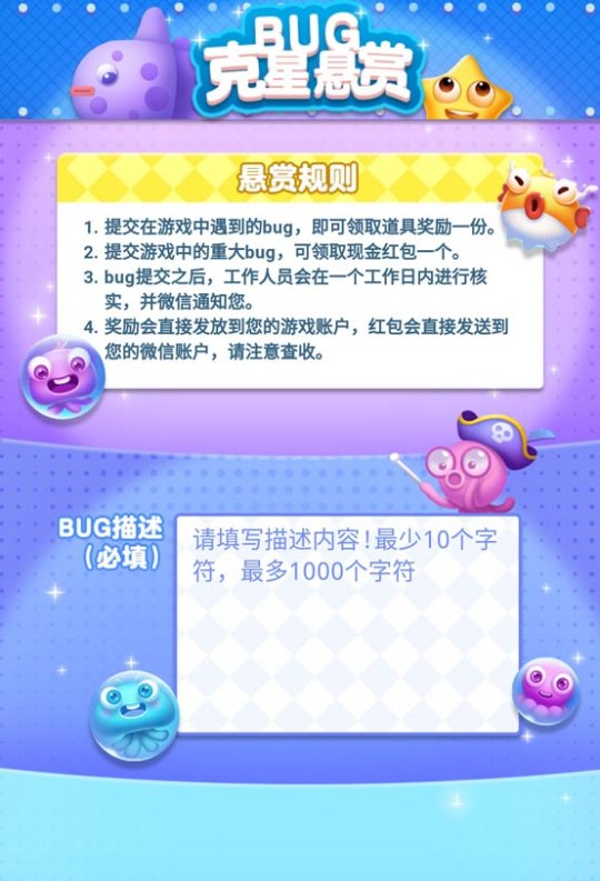 雖然bug是程序員最大的痛,但是在《點點消寶藏》你可以盡情吐槽你在游戲中遇到的bug,并且還能獲得bug反饋獎勵,是不是有點小激動。經(jīng)過工作人員評估之后,如果你提交的是重大bug,還能獲得現(xiàn)金獎勵。