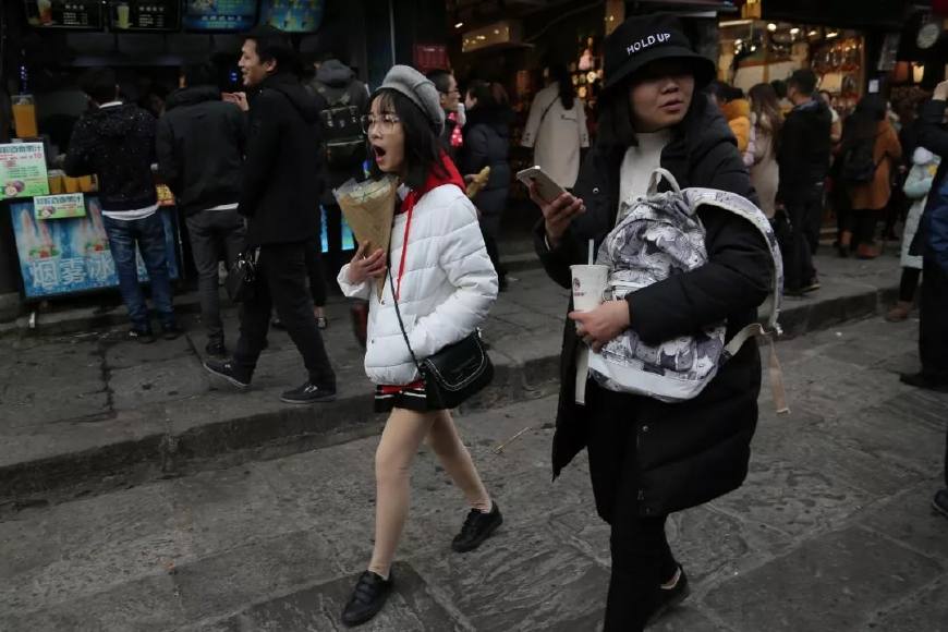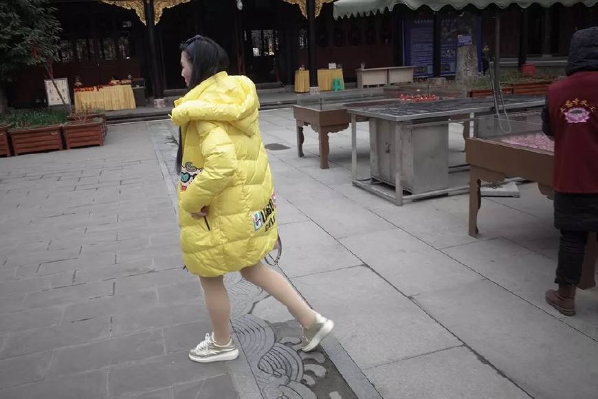 成都,武侯祠。一姑娘身著黃色羽絨服,搭配短裙。這組圖片拍攝于2月5至7日。數(shù)九寒天之際,來(lái)自北方的攝影師白杉在成都,重慶旅行時(shí),隨處可以看到一些年輕女孩兒們穿著短褲的畫(huà)面,雖然西南沒(méi)有北方那么干冷,但濕冷天氣下的保暖措施還是很有必要,不過(guò)對(duì)于“要風(fēng)度不要溫度”的她們來(lái)說(shuō),愛(ài)美,或許才是主要的。[本組攝影|白杉;發(fā)布|白背影]