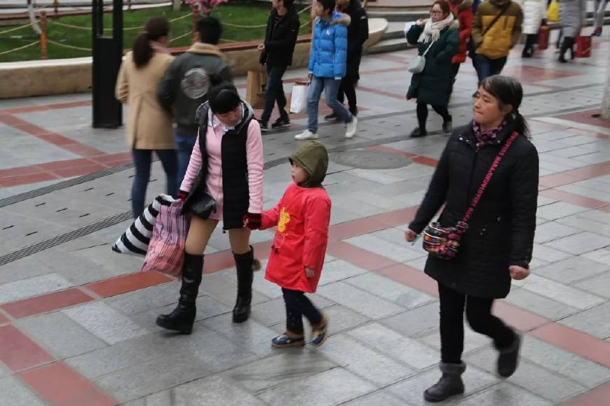 重慶,牽著孩子的女人,穿著大長(zhǎng)靴,上衣覆蓋在大腿上,幾乎看不到短褲了。 白杉|攝
