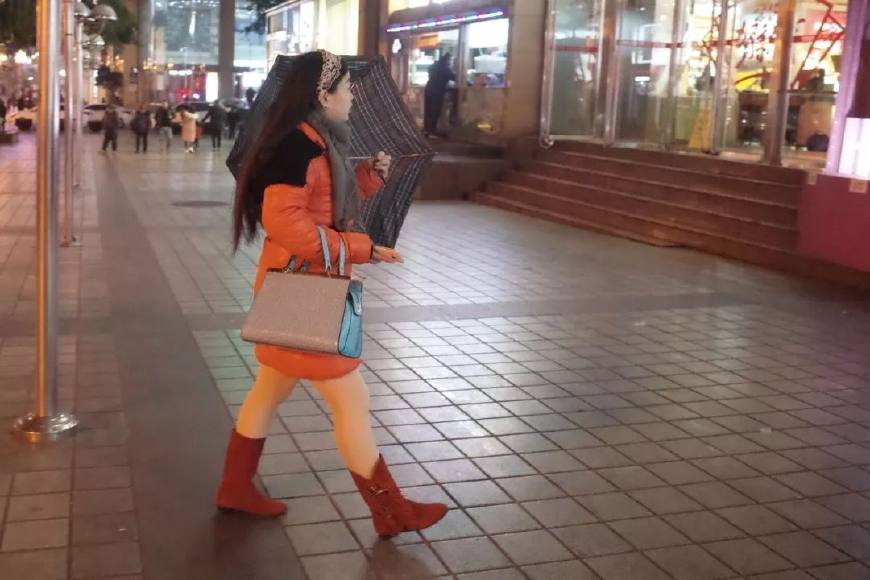 重慶,兩江口站,一女子身著短褲,皮衣搭配皮靴,看起來(lái)似乎沒(méi)那么冷。 白杉|攝