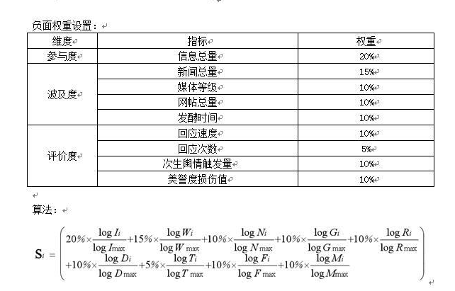 4、波及度由負面新聞總量、媒體等級、網帖總量、發(fā)酵時間四個指標構成。