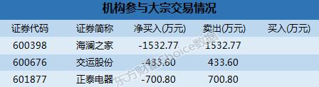 3月19日,滬市共有12只個股發(fā)生大宗交易,其中貴州茅臺折價率為-11.5%,為滬市折價最高個股。當(dāng)天滬市大宗交易個股中,有1只平價交易,11只折價交易。 折價大宗交易: 當(dāng)天,滬市折價前三個股為貴州茅臺、杭叉集團和寧波建工。 貴州茅臺折價率為-11.5%,由中信證券太原南中環(huán)街賣出0.3萬股,共計200.04萬元,至中信證券太原南中環(huán)街。 杭叉集團折價率為-11.12%,由中信證券廈門蓮岳路賣出50.1萬股,共計656.81萬元,至中信證券杭州杭大路。 寧波建工折價率為-10.42%,由中信證券廈門蓮岳路賣出136萬股,共計490.96萬元,至中信證券寧波甬江大道。 金額較大交易: 當(dāng)天,滬市大宗交易成交金額過億個股有西藏珠峰和長園集團。 西藏珠峰成交金額為25486.96萬元,折價率-4.51%,由華林證券北京新華西街賣出700萬股,至中信證券北京東三環(huán)中路(230萬股,8374.26萬元)和中信證券總部(非營業(yè)場所)(470萬股,17112.7萬元)。 長園集團成交金額為25050萬元,折價率-3.02%,由中泰證券深圳吉祥路賣出1500萬股,至中信證券海寧海昌南路(300萬股,5010萬元)、中信證券杭州鳳起路(500萬股,8350萬元)和東興證券上海肇嘉浜路(700萬股,11690萬元)。 機構(gòu)參與交易: 當(dāng)天,機構(gòu)參與滬市大宗交易涉及三只個股,全部為凈賣出,其中海瀾之家被賣出最多,為1532.77萬元。