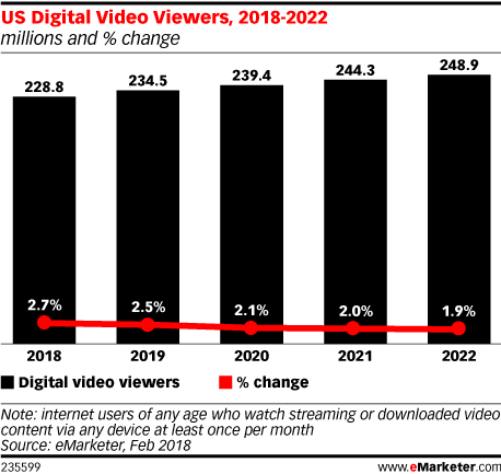 \u00A0\u00A0\u00A0\u00A0\u00A0\u00A0\u00A0\u00A0eMarketer預(yù)計今年美國網(wǎng)絡(luò)視頻觀眾數(shù)量將達(dá)到2.288億。到2022年,這一數(shù)字將增加到2.489億。