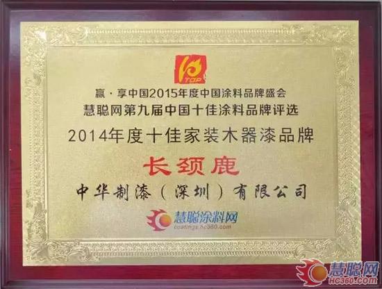 \u00A0\u00A0\u00A0\u00A0慧聰化工網(wǎng)訊:2015年7月7日,由慧聰網(wǎng)主辦的“贏享中國――2015中國涂料品牌盛會暨慧聰網(wǎng)第九屆中國十佳涂料品牌評選頒獎盛典”,在廣州白云國際會議中心隆重召開。中華制漆旗下品牌長頸鹿漆再度榮獲“十佳家裝木器漆品牌”殊榮。