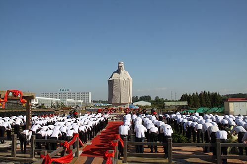 孔子像是一尊全貌復(fù)原,原在天安門廣場歷史博物館門前的孔子像。它采用五蓮紅優(yōu)質(zhì)花崗巖制成,加底座總重量約1000余噸,其底座為正方形,四面各邊長7.3米、寓意:孔子在世73年。孔子圣像高9.5米,體現(xiàn)了“九五之尊”,其圣像前,有精雕細(xì)琢的供奉石案,四周地面中心位置和外側(cè)分別是用紅色和灰白色成都石板鋪成。四周是花雕精美的石欄,石欄中間分別鑲嵌有51副精美的石刻浮雕圖畫,展示了孔子一生的主要經(jīng)歷。