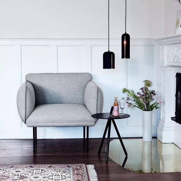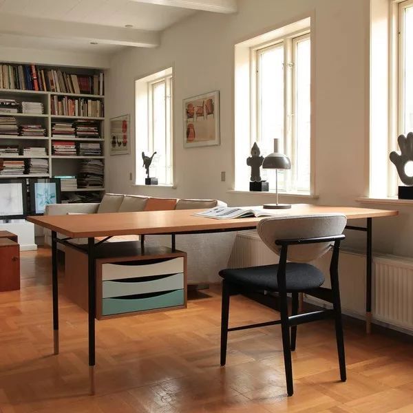 位于房間休憩一角的Poet Sofa(詩人沙發(fā)),搭配邊桌Pelican Table(鵜鶘邊桌);書桌邊的109扶手椅。