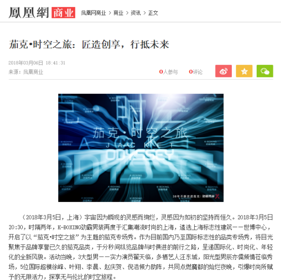 “匠造創(chuàng)享,行抵未來“ 。騰訊、新浪、鳳凰、搜狐、網(wǎng)易等門戶網(wǎng)站以及澎湃新聞、環(huán)球網(wǎng)、一點(diǎn)資訊、大眾新聞網(wǎng)等聚焦此次K-BOXING勁霸男裝茄克專場秀在中國男士時(shí)尚界的劃時(shí)代意義,作為享譽(yù)已久的茄克品類,K-BOXING勁霸男裝于分秒間縱覽品牌與時(shí)俱進(jìn)的前行之路。