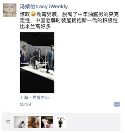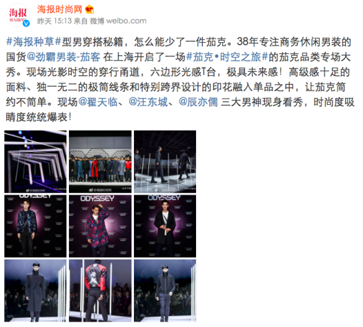 不但如此,來自時(shí)尚先生、風(fēng)度、周末畫報(bào)、旅游衛(wèi)視等出席活動(dòng)的各位媒體嘉賓紛紛在朋友圈曬出活動(dòng)現(xiàn)場圖片,以個(gè)人角度表達(dá)出了對(duì)此次“茄克?時(shí)空之旅”的高度肯定以及對(duì)秀款服裝的好感。