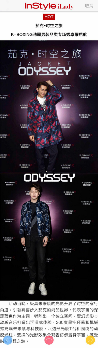 優(yōu)家畫報(bào)、StyleTV時(shí)尚網(wǎng)、海報(bào)網(wǎng)、NewStar潮星等時(shí)尚新媒體則更多的向時(shí)尚人士傳達(dá)了秀場的震撼效果,360度星空環(huán)幕和機(jī)械臂充滿未來感與科技感,六邊形光感T臺(tái)和圍繞的動(dòng)感光柱,變換的光影效果令觀者仿佛置身宇宙,感受時(shí)空旅程之魅。并分享了此次秀場單品在功能性面料和設(shè)計(jì)工藝上的獨(dú)到之處,以及更多男士茄克的時(shí)尚穿搭資訊。