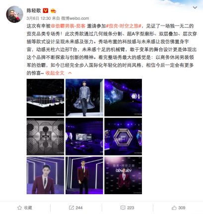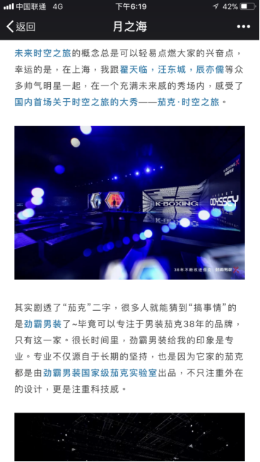 不僅如此,小金牙通過微信平臺(tái),分享了茄克之于男性著裝中的非凡意義,并深度解讀了此次K-BOXING勁霸男裝秀款的設(shè)計(jì)理念。