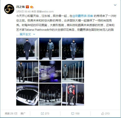“從宇宙投影與led燈柱的秀場(chǎng)設(shè)計(jì)到透露著極簡(jiǎn)主義與建筑線條的多元秀服,整個(gè)秀場(chǎng)都彌漫著引人入勝的未來之感。勁霸男裝更與俄羅斯藝術(shù)家Tatiana Plakhova跨界合作,具象的刺繡美學(xué)承載著對(duì)抽象宇宙概念的表達(dá),很有意思。”