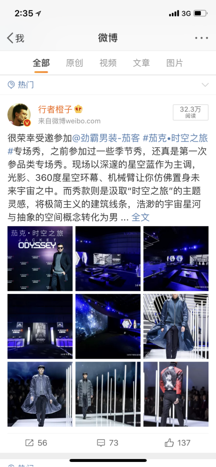 擁有40多萬鐵粉的時(shí)尚知名旅行攝影師行者橙子,對(duì)于此次茄克品類專場(chǎng)秀主題以及前衛(wèi)的秀場(chǎng)布置表露欣喜之情。