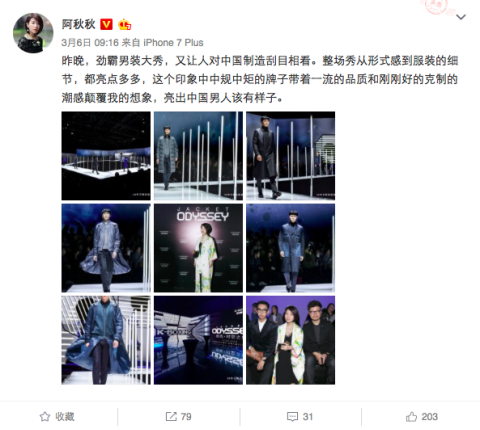 女性時(shí)尚達(dá)人又如何看待“茄克?時(shí)空之旅”呢?作家、時(shí)裝博主阿秋秋也親臨現(xiàn)場(chǎng),帶給我們中國男性茄克設(shè)計(jì)在女性視角之下的獨(dú)特魅力。她認(rèn)為勁霸男裝就是中國男人該有的型。
