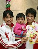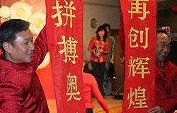 體操隊(duì)總教練黃玉斌穿起了唐裝,拉起春聯(lián)。李小鵬黃旭兩大隊(duì)長“送福”上門。還有女子柔道隊(duì)、女子網(wǎng)球隊(duì),她們手持金鼠,傳遞著鼠年的喜慶和歡樂。馬明宇為首的成都謝聯(lián)明星們也穿起了大紅袍,手舉中國結(jié),一副喜氣洋洋。