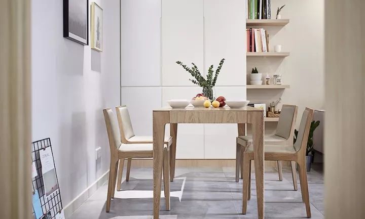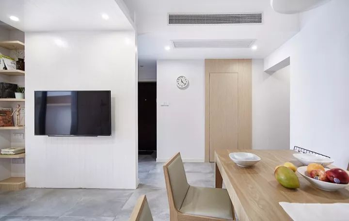 從餐廳的角度看電視墻,轉(zhuǎn)角的小空間也要利用起來(lái)。