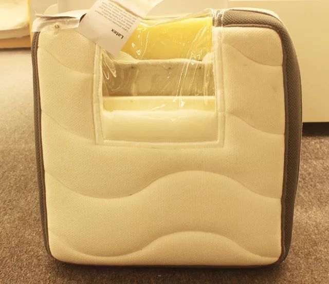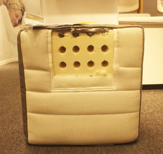 內(nèi)芯對(duì)比:床墊內(nèi)芯最上面層是天然乳膠,據(jù)我們實(shí)際測(cè)量,乳膠的實(shí)際厚度不足3cm,實(shí)測(cè)2.7cm,整體來(lái)說(shuō)乳膠層還是較薄。(如果要買乳膠床墊的,建議乳膠層4cm以上)底層是舒適的填充材料,目測(cè)應(yīng)該是普通的海綿。