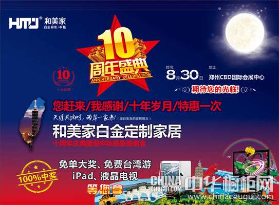】8月30日,和美家白金廚柜·衣柜“十周年慶典及中秋感恩答謝會”大型活動將盛大舉辦,一場感恩鉅獻的特惠饋贈活動即將華麗啟幕!此次10周年慶典活動由和美家白金廚具有限公司廠家發(fā)起,全國300家門店傾力加盟,讓利終端,震撼全國!神秘大禮包我們?yōu)槟鷾蕚浜昧?更多活動驚喜,現(xiàn)場與您一同揭曉!您還等什么?抓緊拿起電話或者找附近經(jīng)銷商報名吧!【活動預演·即將開啟】2014年8月8日,“十周年慶典及中秋感恩答謝...