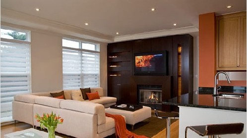 編者按:在裝修客廳的時候我們總是對色彩搭配表示煩惱,喜歡溫馨可愛的風格但是又怕色彩用多了反顯俗氣,喜歡簡約深沉的風格但是擔心顏色暗淡略顯單調。裝修時色彩打牌是一門學問,下面來和小編欣賞一下十款客廳的色彩搭配吧!以小客廳緊靠廚房設計,L型的沙發(fā)將客廳自然地隔離出來。多功能的電視柜,是小客廳的不錯選擇,既能有效節(jié)省空間,又具備一定的收納功能。米白色的沙發(fā)上擺放橙色的靠墊,給這個客廳增加了一點色彩。室內...
