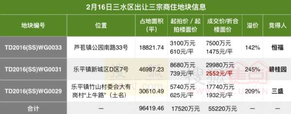佛山搜狐焦點訊\u00A02月16日,三水區(qū)一口氣出讓三宗商住地,地塊分別位于樂平鎮(zhèn)、蘆苞鎮(zhèn)兩鎮(zhèn)街,雖然地塊并非在中心區(qū)域,但卻均以高溢價成交。其中,碧桂園以29980萬元競得三水樂平新城地塊,溢價245%,折合2552元/平米;三盛地產(chǎn)以17740萬元競得樂平“上牛路”地塊,折合樓面價1932元/平米,溢價209%;恒福則以7500萬元競得三水蘆苞鎮(zhèn)地塊,折合樓面價1475元/平米,溢價142%...