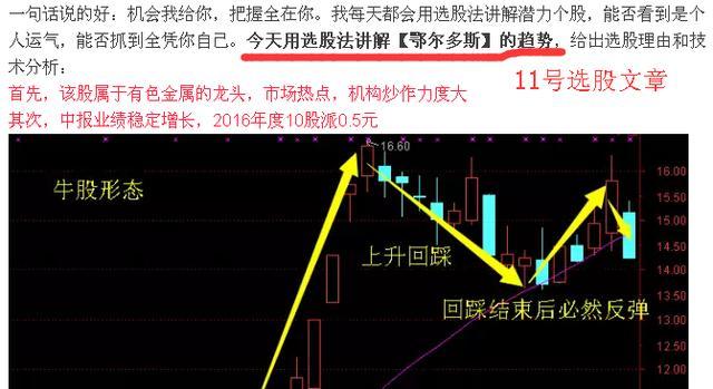炒股先選股,選出一只牛股,在回調到低位買入,等大漲后獲利賣出,收益就到手了,這就是短線操作之道。很多人問:如何選股?其實,選股最重要的就兩點:其一,熱點板塊;其二,具備牛股的形態(tài)。首先,牛股大多出自熱點板塊,比如說石墨烯的方大炭素、煤炭有色的神火股份、鄂爾多斯等等;其次,牛股都具備一定的形態(tài)特征,只要掌握其應該具備的基本形態(tài),再結合當下的熱點,就能很輕松的選到牛股。想看更多關于股市的最新消息請加本...