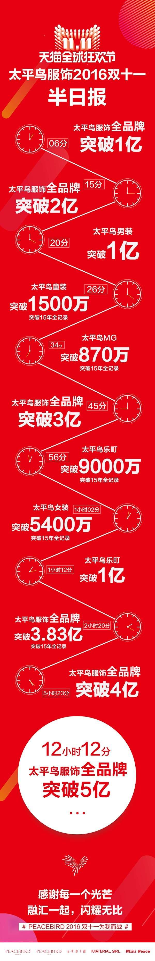 消息:12時12分,突破5億大關;13時45分,太平鳥破2億;13時59分,太平鳥破億。此時,旗下5個品牌已有包括太平鳥男裝、太平鳥女裝和樂町過億。“寧波是‘男裝大市’,西服、襯衣的產(chǎn)量都是國內數(shù)一數(shù)二的。進入行業(yè)之初,我們也是首選男裝。”太平鳥董事長張江平向聯(lián)商網(wǎng)記者闡述到。而男裝,在太平鳥5大品牌中也一直扮演著舉足輕重的作用。自2010年首次參加雙11,一度排名男裝前10。期間,2015年成績...