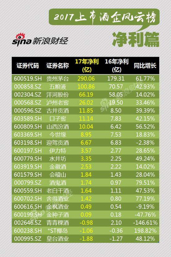 原標(biāo)題:2017上市酒企賺錢(qián)榜:茅臺(tái)一騎絕塵洋河增速明顯落后誰(shuí)是上市酒企“賺錢(qián)王”?22家上市白酒企業(yè)2017年業(yè)績(jī)實(shí)現(xiàn)大豐收。超9成實(shí)現(xiàn)凈利上漲,有11家凈利增幅超過(guò)30%。茅臺(tái)依然是最賺錢(qián)的酒企,凈利潤(rùn)達(dá)到270.79億元,其中茅五洋名列前茅,凈利突破50億大關(guān)。被喻為“白酒行業(yè)第一梯隊(duì)”的五糧液(70.600,-0.62,-0.87%)和洋河股份(115.200,-0.84,-0.72%)2...