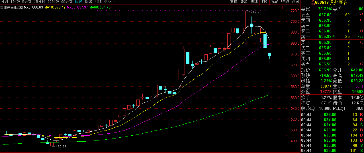原標(biāo)題:貴州茅臺(tái)4連跌股價(jià)到頂了?券商喊出1.85萬億市值,管理層發(fā)聲“降溫”11月22日,貴州茅臺(tái)(600519)股價(jià)下跌26.73元,報(bào)收于650.52元,這是公司連續(xù)4個(gè)交易日股價(jià)下跌,距離此前創(chuàng)下719.96元的A股最高紀(jì)錄,剛剛過去了4個(gè)交易日。日前,安信證券發(fā)布研報(bào)表示,“貴州茅臺(tái)在目前清晰的產(chǎn)能規(guī)劃下可預(yù)估的市值有望達(dá)到1.85萬億上下”,并調(diào)高目標(biāo)價(jià)至900元。然而,此舉遭到上交所...