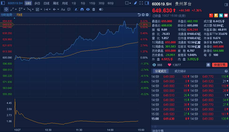 證券時報網(wǎng)10月27日訊在茅臺(600519,股吧)公布業(yè)績的第二交易日,公司股價延續(xù)升勢繼續(xù)大漲,截至收盤,茅臺股價報649.63元,收漲7.36%,總市值達到8161億元。兩日內(nèi),公司股價累計上漲了14.84%,剔除一般法人后,機構(gòu)兩日內(nèi)浮盈逾60億元,國家隊浮盈近30億元。據(jù)wind數(shù)據(jù)顯示,截至三季報,持有貴州茅臺(600519,股吧)的機構(gòu)品種達到540只,涉及機構(gòu)90多家,持股合計達9...